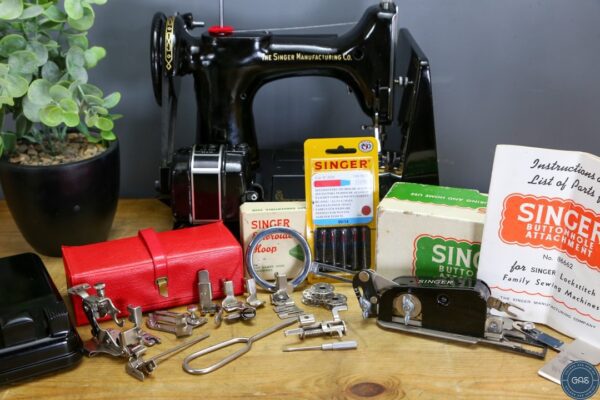 This fully serviced Singer 222k featherweight free-arm sewing machine, known as the “Perfect Portable,” comes with loads of extras including a black case, and the original foot control. Everything is Simanco stamped for authenticity. This machine has been professionally serviced and is ready to use.