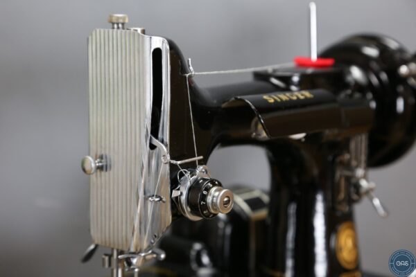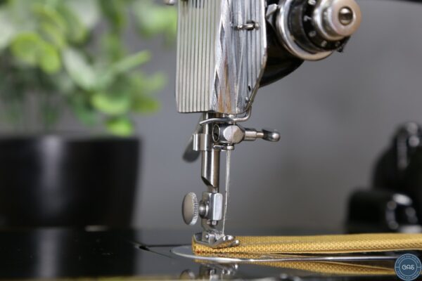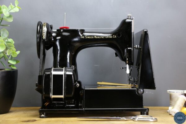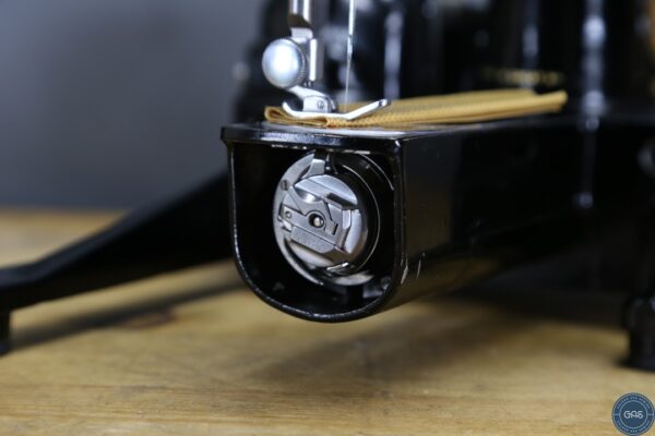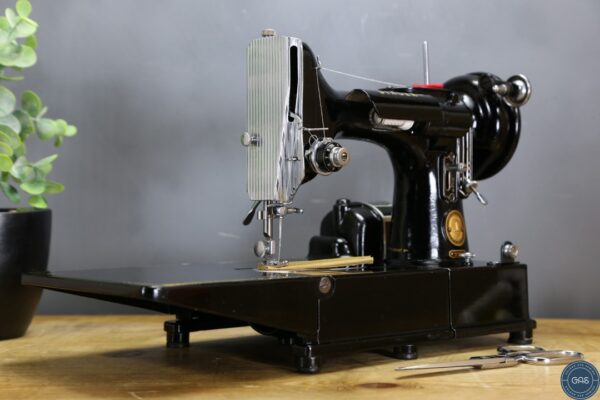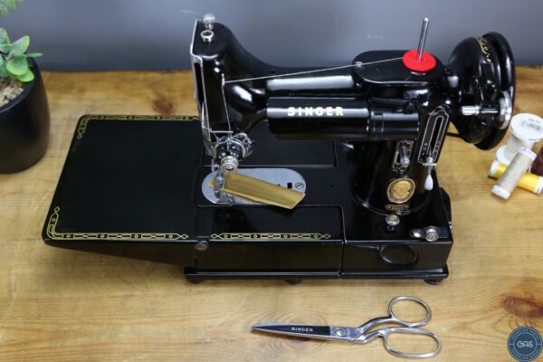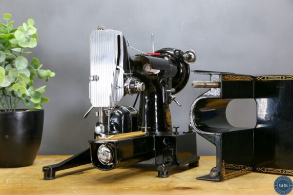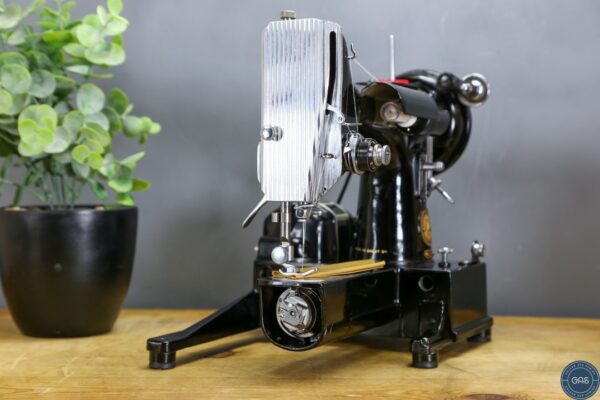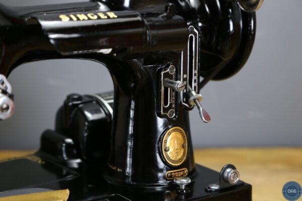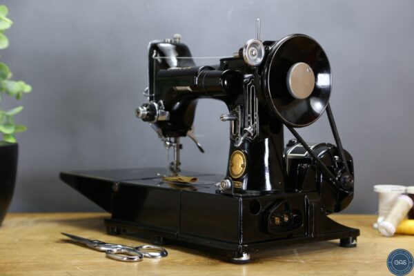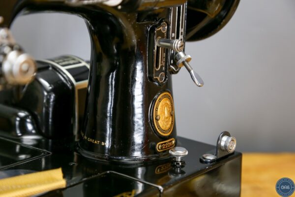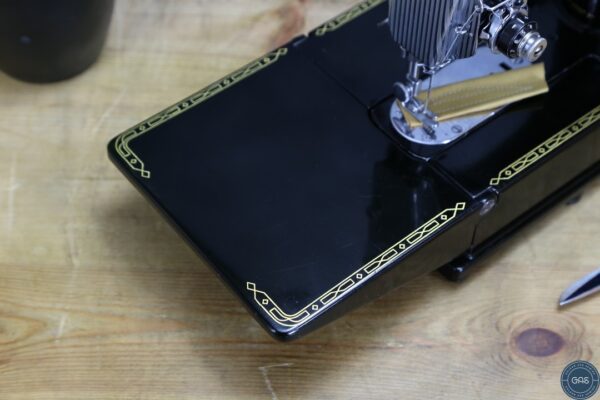 It is in excellent condition, with vibrant gold decals, glossy black paint, and shiny chrome fixtures. The 222k is an aluminium sewing machine produced in Clydebank, Scotland, serial Number EK628189, dating to 1955.
